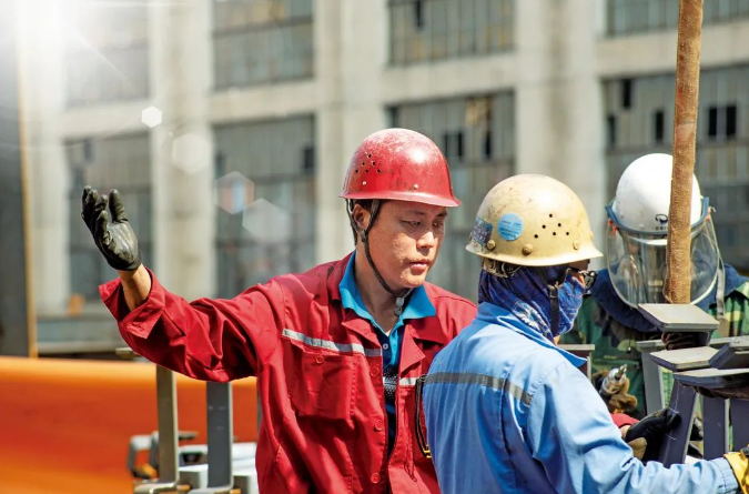 午后,吊裝工人董師傅在烈日下指揮吊運。