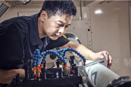 七〇八所海迅公司生產部的員工計師傅雖已汗如雨下,仍專注于銑床加工之中。