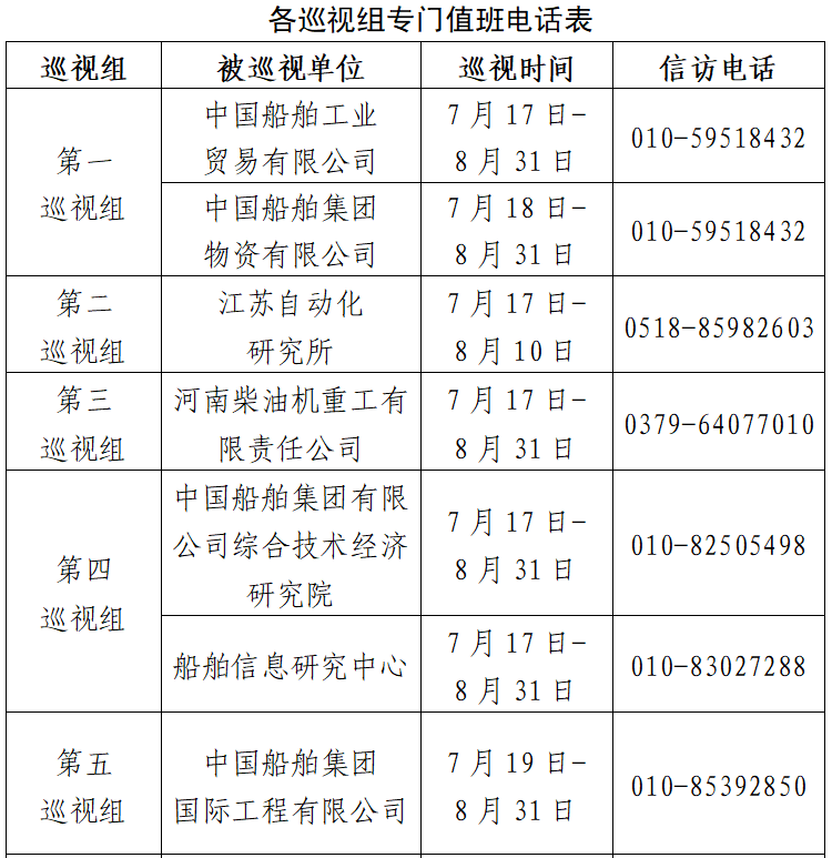 根據(jù)中國船舶集團(tuán)黨組2023年第一輪巡視工作部署,截至2023年7月17日,巡視工作已經(jīng)鋪開。其中,對中國船舶工業(yè)貿(mào)易有限公司、中國船舶集團(tuán)物資有限公司、江蘇自動化研究所、河南柴油機(jī)重工有限責(zé)任公司、中國船舶集團(tuán)有限公司綜合技術(shù)經(jīng)濟(jì)研究院、船舶信息研究中心、中國船舶集團(tuán)國際工程有限公司等7家單位開展常規(guī)巡視,對中船上海船舶工業(yè)有限公司、廣州船舶工業(yè)有限公司等2家單位開展專項(xiàng)巡視,對武漢數(shù)字工程研究所、武漢船用電力推進(jìn)裝置研究所、武漢重工鑄鍛有限責(zé)任公司、中國船舶集團(tuán)長江科技有限公司、中船重工衡遠(yuǎn)科技有限公司等5家單位開展巡視“回頭看”。