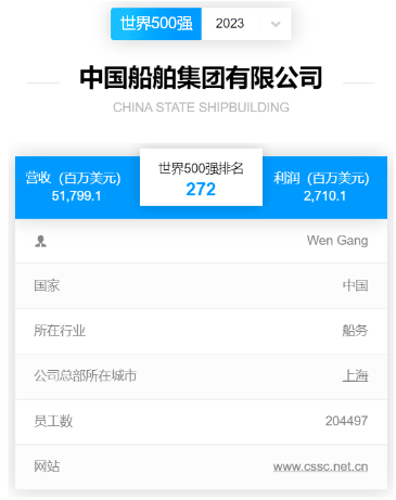 北京時間2023年8月2日,《財富》中英文網(wǎng)站同時發(fā)布2023《財富》世界500強(qiáng)排行榜,中國船舶集團(tuán)有限公司以517.991億美元的營業(yè)收入位列全球榜單第272位,自2021年重組后首次申報以來連續(xù)三年上榜,蟬聯(lián)全球造船企業(yè)首位。
