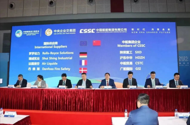 中國船舶集團有限公司黨組書記、董事長溫剛參加第六屆進博會暨虹橋國際經濟論壇開幕式,并參加巡館活動。中國船舶集團黨組成員、副總經理盛紀綱應邀參加虹橋國際經濟論壇“開放創新賦能企業發展”分論壇,出席11月6日下午舉行的第六屆進博會國資委中央企業交易團中國船舶交易分團采購集中簽約儀式并致辭。