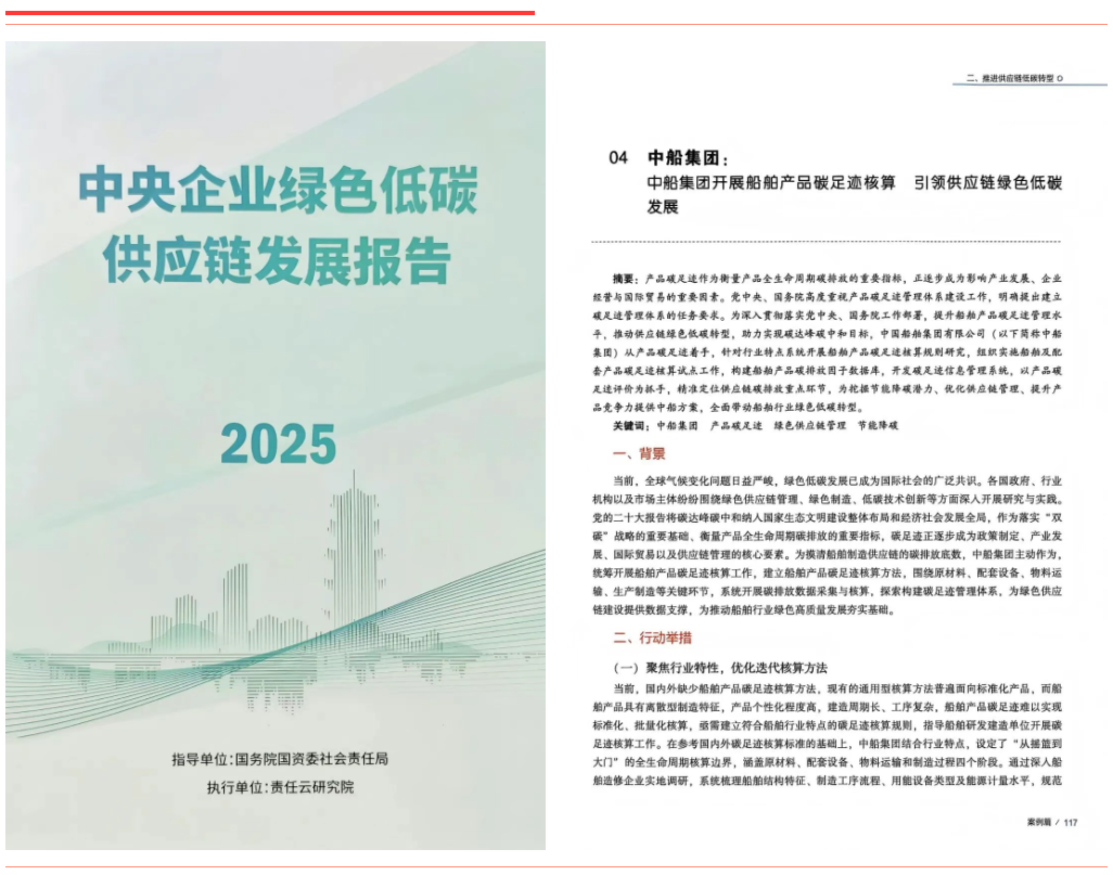 《中船集團(tuán)開展船舶產(chǎn)品碳足跡核算引領(lǐng)綠色供應(yīng)鏈低碳發(fā)展》聚焦船舶產(chǎn)品全生命周期碳足跡核算,構(gòu)建了行業(yè)首套核算規(guī)則與數(shù)據(jù)庫(kù),有效帶動(dòng)供應(yīng)鏈上下游協(xié)同減排。該案例入選《中央企業(yè)綠色低碳供應(yīng)鏈發(fā)展報(bào)告(2025)》。