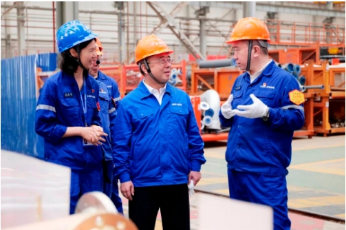 王國強深入科研生產一線,察看了船塢、智能生產線、重點實驗室和產品,進行了安全生產檢查,與一線科研人員、員工進行深入交流,聽取了生產經營、科技研發、人才培養、黨的建設等情況匯報。