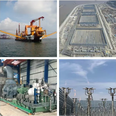 左上:裝有七一一所傳動裝置的挖泥船;左下:816壓縮機;右上及右下:浙石化火炬航拍及近景圖。