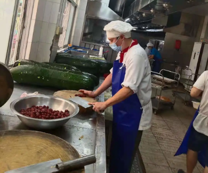 而在技校和養(yǎng)老院的后廚,阮積劍等廚師們同樣已經(jīng)整裝待發(fā)。在社區(qū)封閉初期,飲食服務(wù)部養(yǎng)老院飯?zhí)脝T工由原來的18人劇減至7人。廚師梁志寬面對每日約800人的進(jìn)餐人數(shù),迎難而上,轉(zhuǎn)變菜式花樣,合理優(yōu)化膳食,注重營養(yǎng)搭配,以嫻熟的廚藝獨自完成后廚大量工作,保證了菜肴準(zhǔn)時出品。而廚師、黨員陳兆銘得知飯?zhí)靡蚴芤咔橛绊懚耸謬?yán)重不足,在試航歸來做完核酸檢測后立即回到養(yǎng)老院飯?zhí)玫膷徫簧稀榇耍苯影选凹摇卑苍诹损B(yǎng)老院,每天睡在簡易折疊床上。