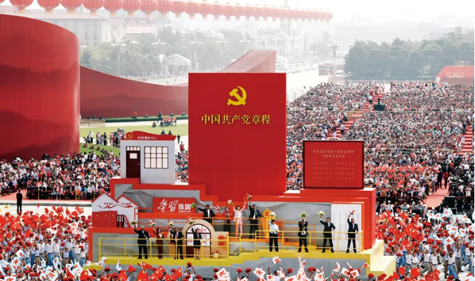 ▲2019年10月1日上午,慶祝中華人民共和國成立70周年大會在北京天安門廣場隆重舉行。這是群眾游行中的“從嚴治黨”方陣。新華社記者 蘭紅光/攝