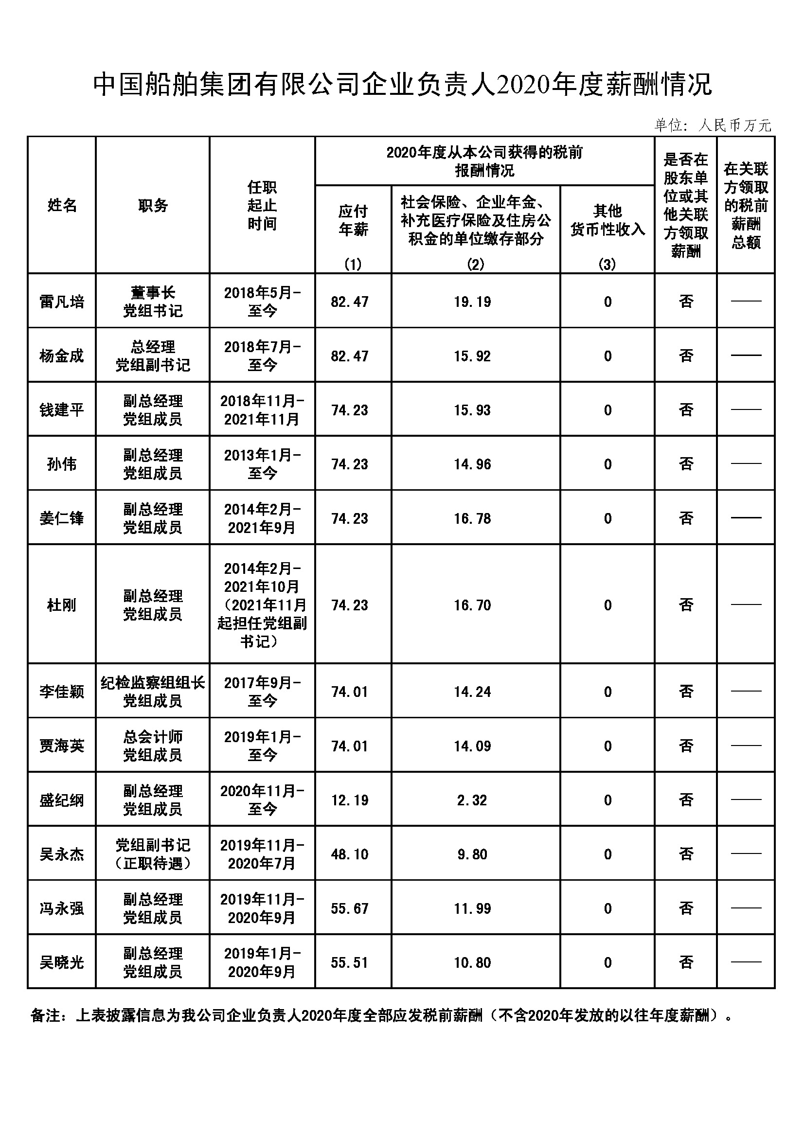中國船舶集團有限公司企業負責人2020年度薪酬情況